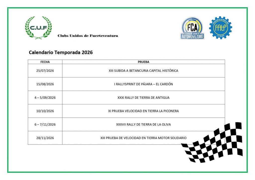 Carta de presentación de los Clubs Unidos de Fuerteventura. Con el calendario de pruebas para el presente año 2026 en la isla majorera. Cinco en las diferentes modalidades del Campeonato de Canarias y una dentro del Campeonato Provincial de Las Palmas.