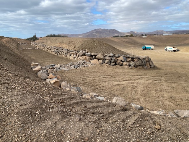 Los trabajos también han incluido la ejecución de un nuevo aliviadero que ha sido protegido mediante una escollera de piedras. De esta forma, en caso de que esta charca reciba más agua de la que pueda almacenar la evacuación del sobrante irá encauzada por el aliviadero con escollera, evitando que esa agua se disperse e inunde zonas urbanizadas del valle de Tarajalejo.
