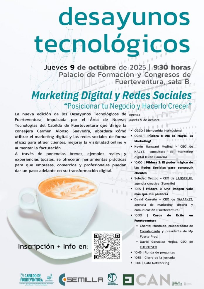 El Cabildo de Fuerteventura, a través de la Consejería de Nuevas Tecnologías que dirige Carmen Alonso, recuerda que sigue abierto el plazo de inscripción para participar en la nueva edición de los Desayunos Tecnológicos, que se celebrará el próximo jueves 9 de octubre, de 9:30 a 11:00 horas, en el Palacio de Formación y Congresos de Fuerteventura.  Abierto el plazo de inscripción para los próximos Desayunos Tecnológicos de Fuerteventura