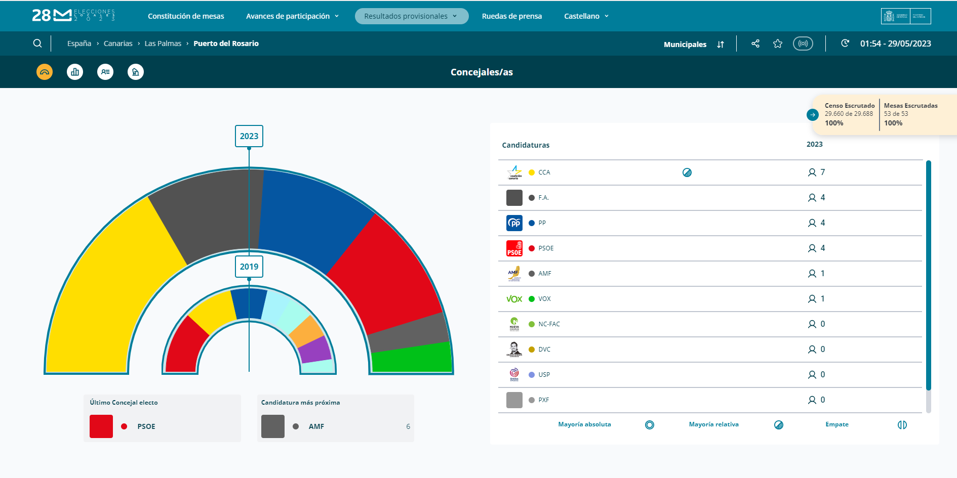 La cuarta posición ha sido para AMF, el partido del actual alcalde, Pedro Armas, con dos concejales. En las anteriores elecciones, en alianza con NC, cosechó tres actas.