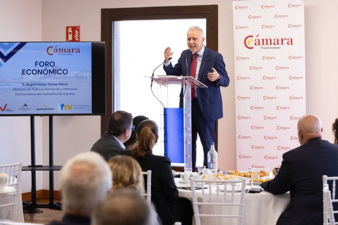 El ministro de Política Territorial y Memoria Democrática, Ángel Víctor Torres, ha participado este lunes en el segundo foro económico organizado por la Cámara de Comercio de Fuerteventura. El encuentro, celebrado en el Hotel El Mirador, ha reunido a representantes institucionales y del sector empresarial para analizar la situación económica y los retos del territorio. Ángel Víctor Torres encabeza el segundo foro económico de la Cámara de Comercio de Fuerteventura.