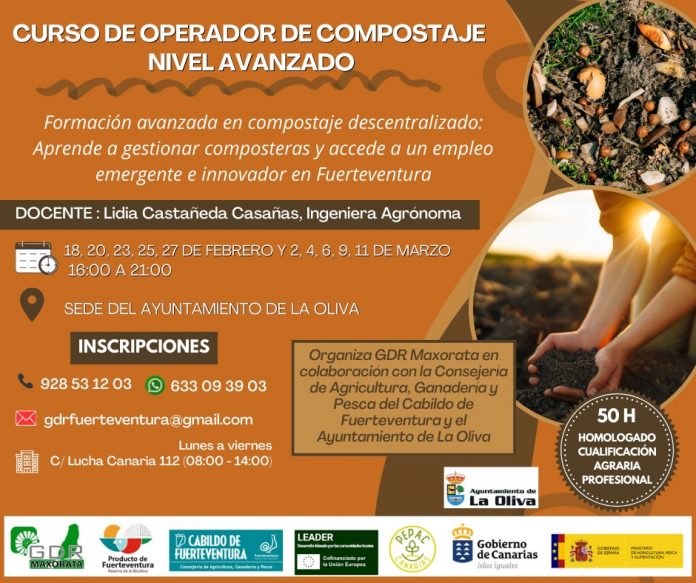 La Asociación para la Gestión del Desarrollo Rural Maxorata Verde (GDR-Maxorata) y el Cabildo de Fuerteventura, a través de la Consejería de Agricultura, Ganadería y Pesca, que dirige Matías Peña, continúan con su programa de cursos formativos para el año 2026, gracias a la financiación de la Intervención 7119 del PEPAC 2023-2027 que reciben los grupos Leader. En este caso, con un curso de operador de compostaje de nivel avanzado para aprender a gestionar composteras y acceder a un empleo emergente e innovador en Fuerteventura. Cabildo y GDR Maxorata imparten un curso avanzado de operador de compostaje