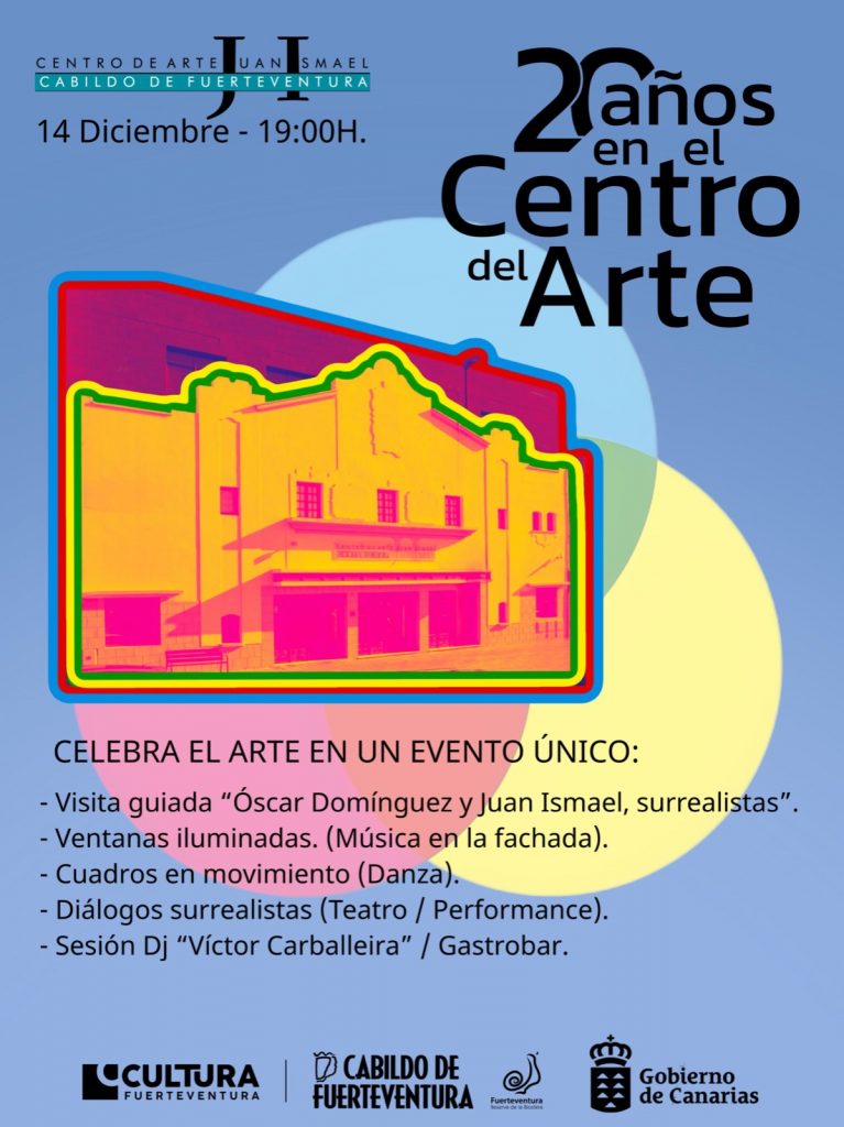 El Centro de Arte Juan Ismael (CAJI) cumple 20 años siendo pilar cultural de Fuerteventura y lo celebrará con un evento multisensorial, que combina lo festivo con la cultura. La noche comenzará a las 19.00 horas con un espectáculo audiovisual en la fachada del centro. La experiencia continuará con actividades de performance con diálogos surrealistas, danza de cuadros en movimiento y una sesión DJ a cargo de Víctor Carballeira, además de foodtrucks y cócteles. CAJI celebra su 20 aniversario con espectáculos audiovisuales y música.