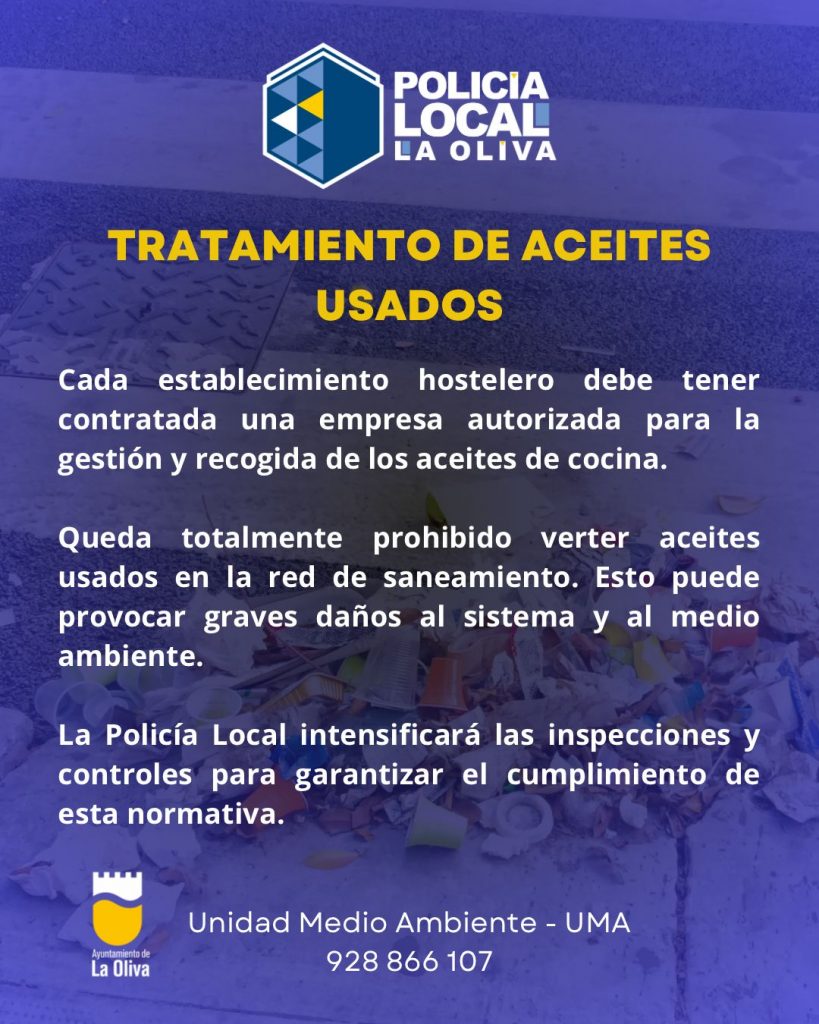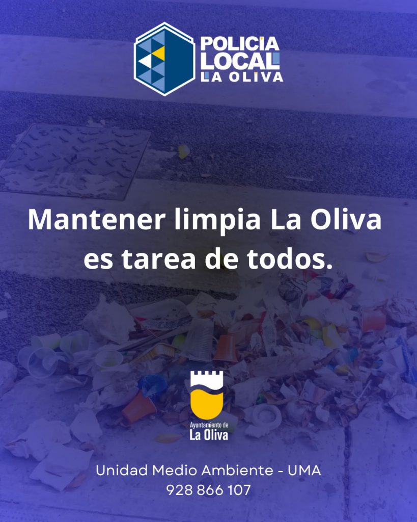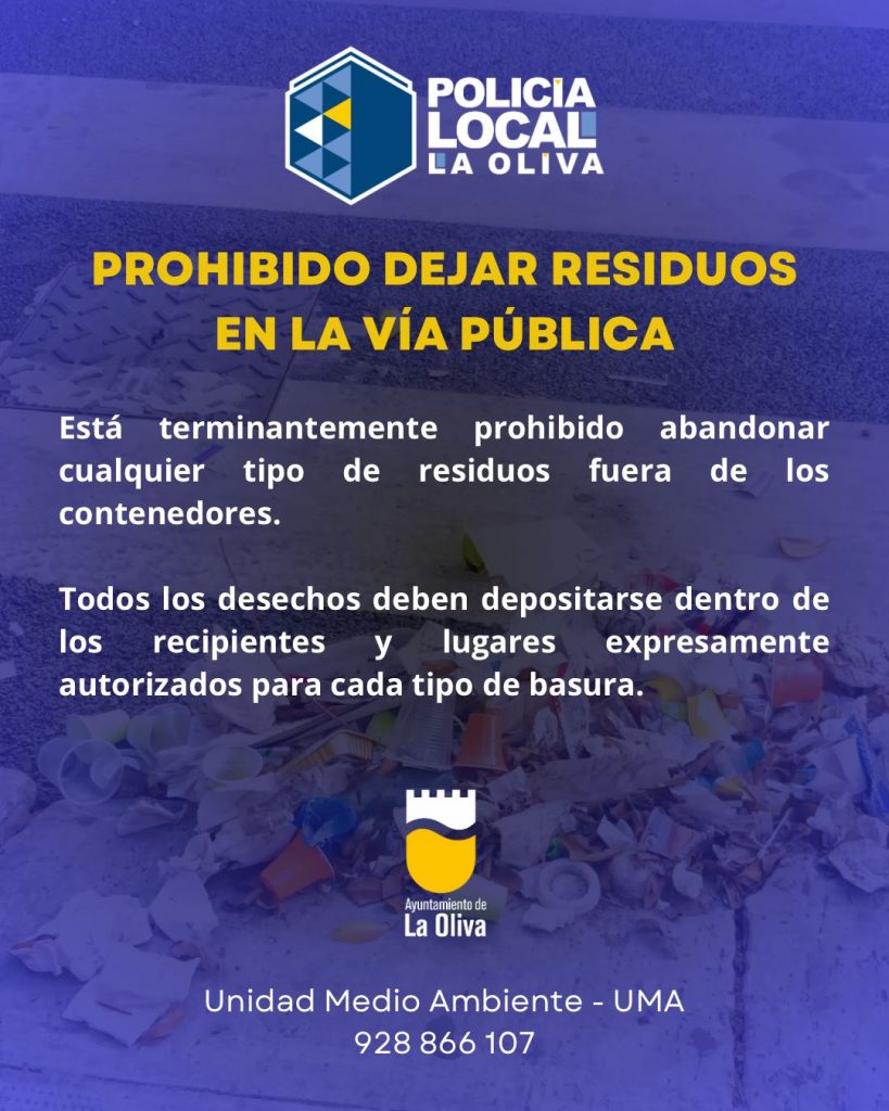El Ayuntamiento de La Oliva, a través de la Policía Local, Medio Ambiente y Limpieza, lanza una campaña informativa que pretende concienciar sobre la ordenanza municipal de residuos a la ciudadanía del municipio. Así pues, la Unidad de Medio Ambiente de la Policía Local, en coordinación con las Concejalías de Medio Ambiente, que gestiona David Fajardo, y la Concejalía de Limpieza, que dirige Rubén González, dan a conocer los diferentes puntos sobre deberes y prohibiciones que contempla esta ordenanza con el fin de mantener el municipio cuidado y limpio. Campaña sobre el buen uso de la ordenanza municipal de residuos en La Oliva.