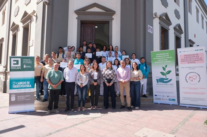 Un total de treinta jóvenes desempleados han finalizado los PFAE-GJ ‘Fuerteventura te cuida en casa’ y ‘Fuerteventura conserva su medio’ del Cabildo insular. Dos programas de alternancia con el empleo de garantía juvenil, dirigidos a personas de entre 16 y 30 años, cuya inversión ha ascendido a casi 900.000 euros entre ambos programas. A los jóvenes alumnos-trabajadores se le suman las personas que formaron parte del equipo directivo, coordinador, docente y apoyo administrativo, alcanzando las cuarenta personas. Cuarenta personas finalizan con éxito los dos PFAE-GJ del Cabildo con una inversión de casi 900.000 euros