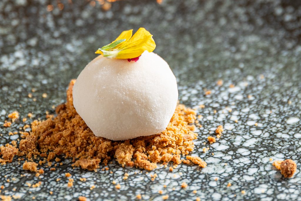 Acompañando el mochi, la chef ha diseñado una imitación de tierra de la isla realizada mediante una galleta clásica elaborada con gofio de millo, huevos camperos y agave, que aporta un crujiente tostado al plato. Además ha añadido un gel de tuno indio canario adornado con hojas de sal de una planta endémica de la costa de Canarias.