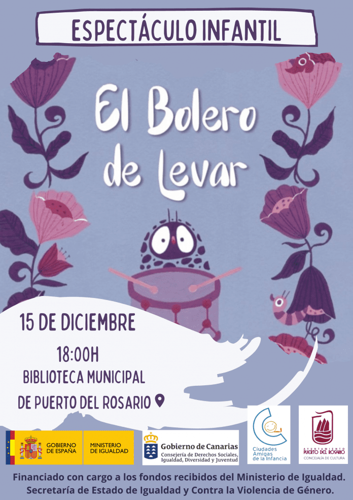 ‘El Bolero de Levar’ el 15 de diciembre en la Semana Literaria. La Biblioteca Municipal de Puerto del Rosario acoge este jueves, 15 de diciembre, a las 18.00 horas, el espectáculo infantil ‘El Bolero de Levar’. Dentro de la programación de la Semana Literaria de Puerto del Rosario 2022 que ha impulsado y organizado la Concejalía de Cultura del Ayuntamiento de la capital que dirige el concejal Juan Manuel Verdugo.