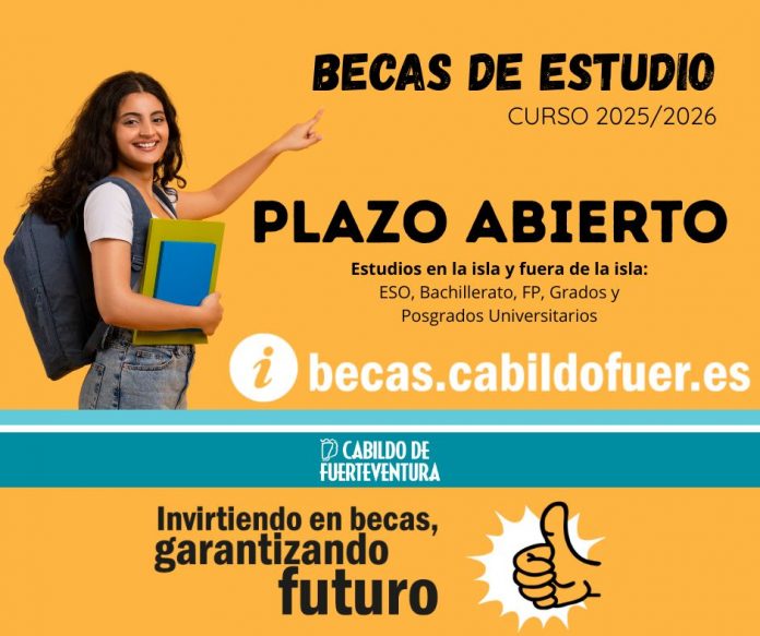 El Cabildo de Fuerteventura, a través de la Consejería de Educación, ha abierto hoy la convocatoria de becas de estudios dentro y fuera de la Isla para el curso académico 2025/2026. Las personas interesadas tienen hasta el 15 de octubre para solicitarlas a través de https://becas.cabildofuer.es El Cabildo abre la convocatoria de becas al estudio dentro y fuera de la Isla