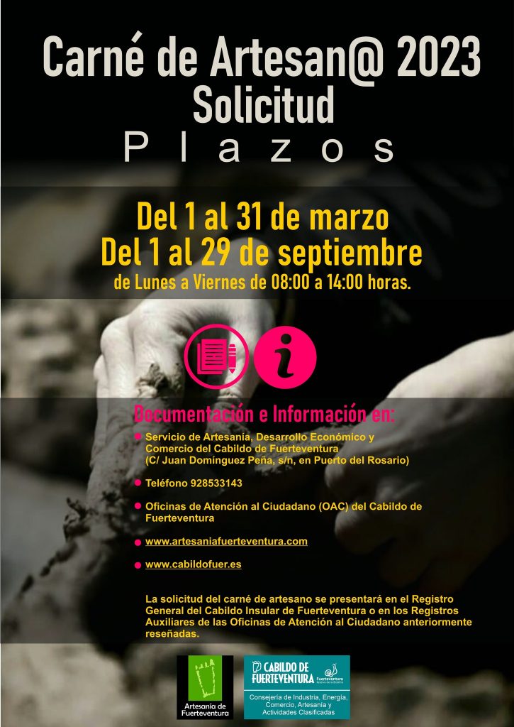 El Cabildo de Fuerteventura vuelve a abrir la convocatoria oficial de plazos para solicitar el carné de artesano en 2023, una certificación que reconoce el valor de la artesanía local y la promueve en la Isla. El período de admisión de solicitudes estará abierto hasta el 29 de septiembre y se recibirán en el Registro General de la Corporación insular o en las Oficinas de Atención Ciudadana. El Cabildo de Fuerteventura abre el plazo para obtener el carné de artesano .