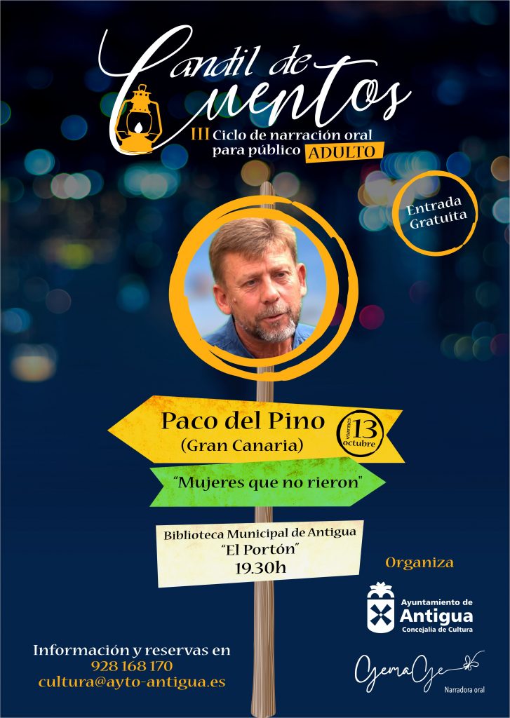 Este viernes 13 a las 19:30 horas, la Biblioteca Municipal de Antigua, El Portón, vuelve a abrir sus puertas, en esta ocasión para recibir llegado desde Gran canaria a Paco del Pino que nos ofrece sus cuentos sobre Mujeres que no rieron, sin duda historias donde las protagonistas nos conmoverán por su entereza, humor, o formas de pensar y actuar.