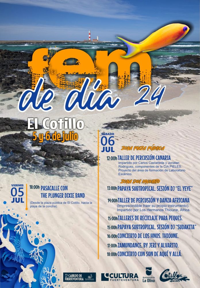 Fuerteventura en Música (FEM) 2024 contará los días 5 y 6 de julio con una variada programación de actividades de día, organizada por el Cabildo de Fuerteventura y la Asociación Cotillo Joven. De esta manera, se ofrece una propuesta diurna de actividades culturales que servirán de complemento al festival, dinamizando el casco antiguo y urbano de El Cotillo, “un pueblo que, tradicionalmente, ha contado con mucha implicación y participación cultural”, explica el consejero de Cultura, Rayco León. El FEM 2024 contará con una variada programación de día en El Cotillo.