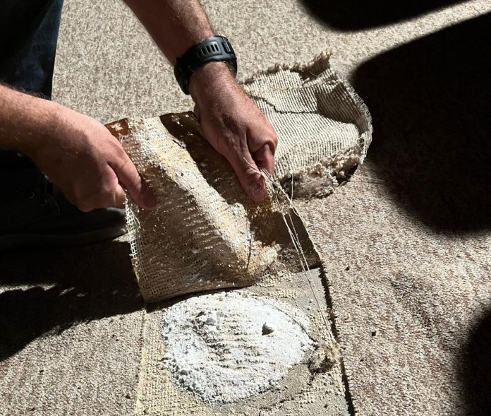 “El suelo del auditorio presenta unas eflorescencias severas. Las eflorescencias se deben a las sales resultantes tras la evaporación de las humedades que suben por capilaridad desde el terreno bajo la solera. (…)