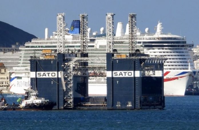 El dique cajonero “SATO Levante”, construido a partir de una pontona preexistente de proyecto español, mide 60 m de eslora y 36 m de manga. Noticia de la publicación ‘Puente de Mando’. El remolcador “VB Hispania” de Boluda conduce el dique cajonero “SATO Levante” a Fuerteventura