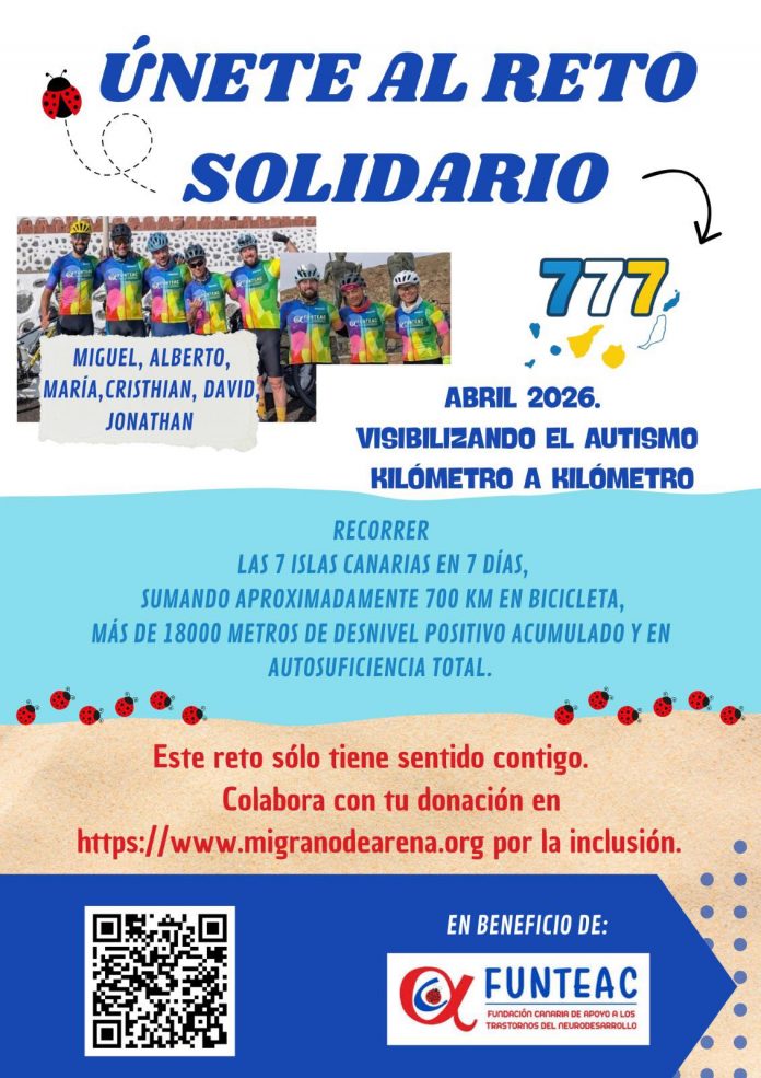 En abril de 2026, Canarias será escenario de un desafío deportivo y humano muy especial: el Reto Solidario 777, una iniciativa que unirá las siete islas en siete días recorriendo más de 700 kilómetros en bicicleta, con más de 18.000 metros de desnivel positivo acumulado y en autosuficiencia total. El Reto Solidario 777 a beneficio de FUNTEAC recorrerá las islas Canarias para visibilizar el autismo