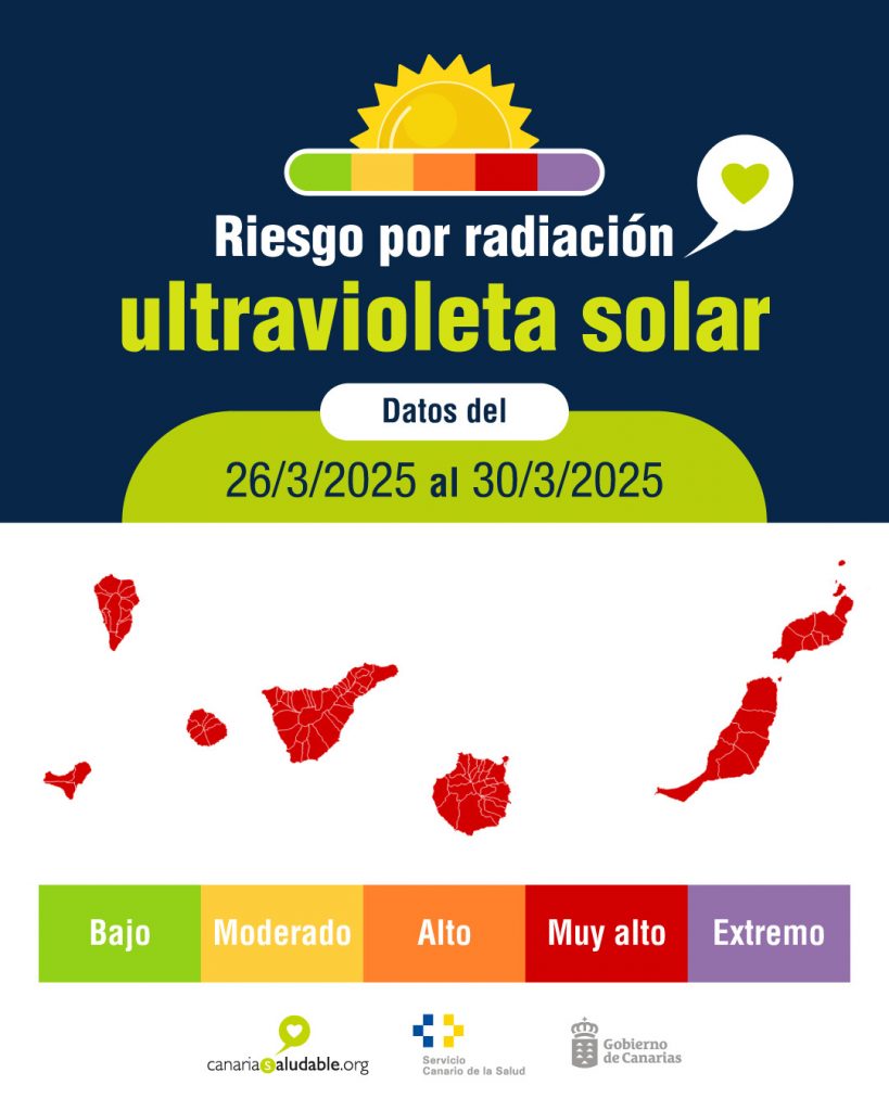 La Consejería de Sanidad del Gobierno de Canarias, a través de la Dirección General de Salud Pública del Servicio Canario de la Salud (SCS), coordina el Plan de Actuaciones Preventivas de los Efectos de la Exposición a la Radiación Ultravioleta en la Salud, que establece una serie de recomendaciones para reducir los efectos en la salud de las personas asociados a la radiación ultravioleta (UV) según los diferentes niveles que se establecen en este Plan. El SCS eleva a muy alto el riesgo por radiación ultravioleta .
