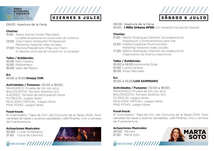 El sábado 6 de julio, la feria continuará con la Milla Urbana #FED a las 10:00 horas, seguida de charlas sobre gestión sociodeportiva y marketing en redes sociales a cargo de Néstor Rodríguez y Diletta Guilione, respectivamente. También habrá talleres y exhibiciones de astronomía solar, lucha canaria y artes marciales, con música a cargo de DJ Luis Sampedro de 10:00 a 14:00 horas.
