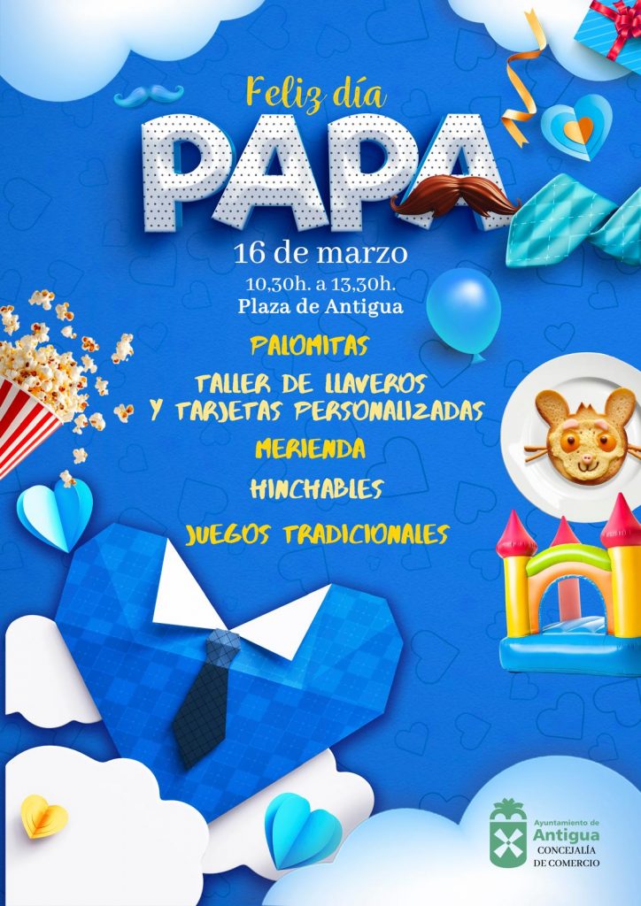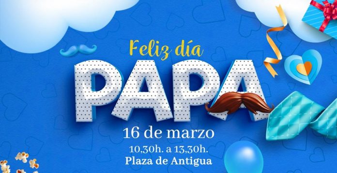 El Ayuntamiento de Antigua desde la concejalía de Comerio organiza la fiesta Feliz día Papá este domingo 16 de marzo en la Plaza de Antigua para disfrute de familias y especialmente de los más pequeños y pequeñas. Fiesta Familiar para celebrar el Día del Padre en Antigua.