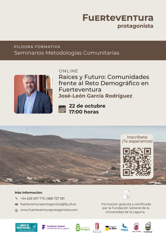 El proyecto ‘Fuerteventura Protagonista’, que promueve la Consejería de Participación Ciudadana junto a Fundación General de la Universidad de La Laguna, continúa impartiendo sus Seminarios de Metodologías Comunitarias (SEMECO). La próxima cita se desarrollará de modo online, el próximo 22 de octubre, de 17.00 a 19.00 horas, se celebrará la sexta sesión: ‘Raíces y Futuro: Comunidades frente al Reto Demográfico en Fuerteventura’ con el objetivo de proporcionar conocimientos clave sobre el tema y su aplicación práctica en contextos comunitarios. ‘Fuerteventura Protagonista’ aborda el reto demográfico a través de sus seminarios