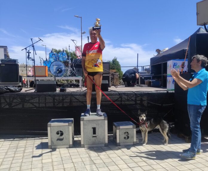 El conocido abogado, Gregorio Fontanilla, deportista consumado y habitual en las pruebas de motor, categoría coches clásicos, ha alzado el primer premio en la modalidad 10 kilómetros de esta prueba popular, la Carrera Trotadunas, cuyos beneficios son destinados a la entidad FUERTEYOGA. Recogía el premio acompañado de su ‘entrenadora’, una perra que ha acompañado sus días de preparación y ha recorrido la prueba de principio a fin junto a Fontanilla.