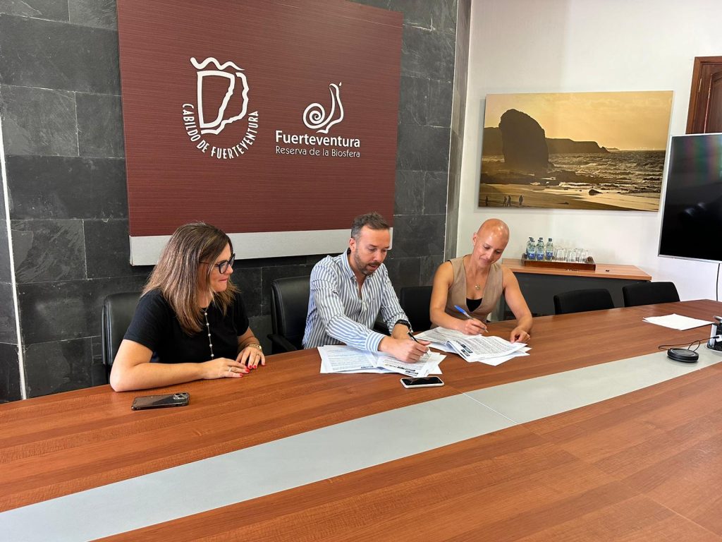 El Cabildo de Fuerteventura y el Ayuntamiento de La Oliva han firmado un convenio de colaboración entre ambas instituciones. Lo han realizado con el objeto de financiar el suministro e instalación del equipamiento deportivo necesario para la puesta en marcha y el desarrollo de actividades en la nueva Pista de Atletismo de Corralejo. Instalaciones que se encuentran en fase final de ejecución, pendiente del trámite administrativo de recepción. En el acto de la firma estuvieron presentes el consejero de Deportes, Luis González, la concejala del área, Gleiber Carreño, y la consejera de Hacienda y Promoción Económica, Nuria Cabrera.