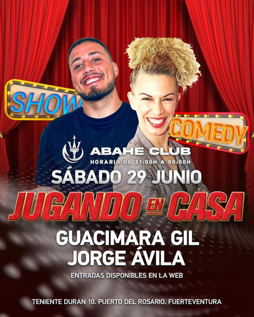 Próximamente tendrán su primer espectáculo humorístico en la sala, «Jugando en Casa», con Guacimara Gil y Jorge Ávila, dos humoristas majoreros que visitarán la sala el próximo sábado 29 de junio y cuyas entradas ya están a la venta a través de su web www.sales.premiumguest.com/abahe-club/es/