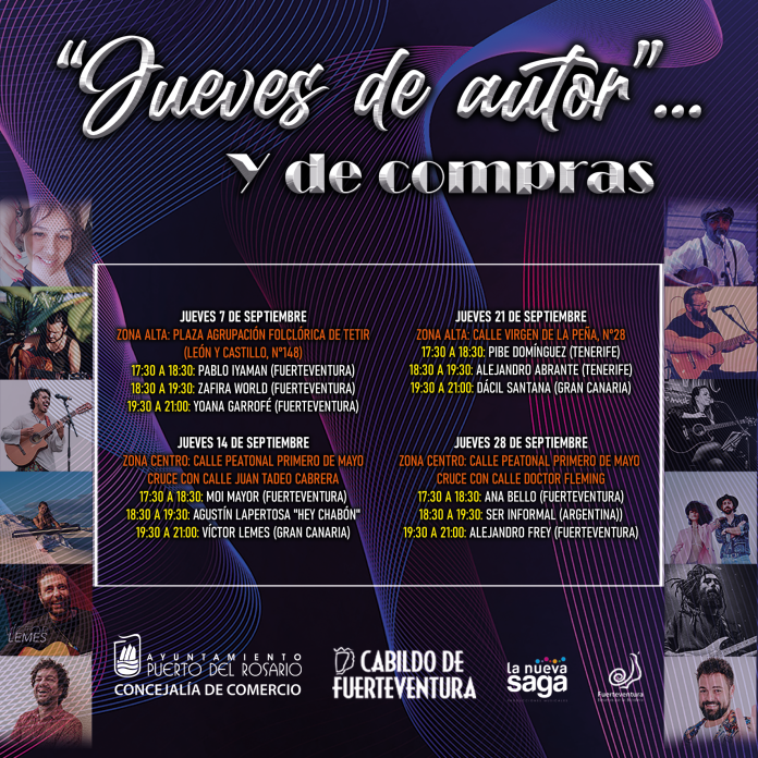 El Ayuntamiento de Puerto del Rosario, a través de la Concejalía de Comercio que dirige Tacoremi Gutiérrez pone en marcha el evento ‘Jueves de autor y de compras’, organizado por La Nueva Saga con la colaboración con la Consejería de Comercio del Cabildo de Fuerteventura, conducida por Paloma Hernández. ‘Jueves de autor y de compras’ este septiembre en Puerto del Rosario.