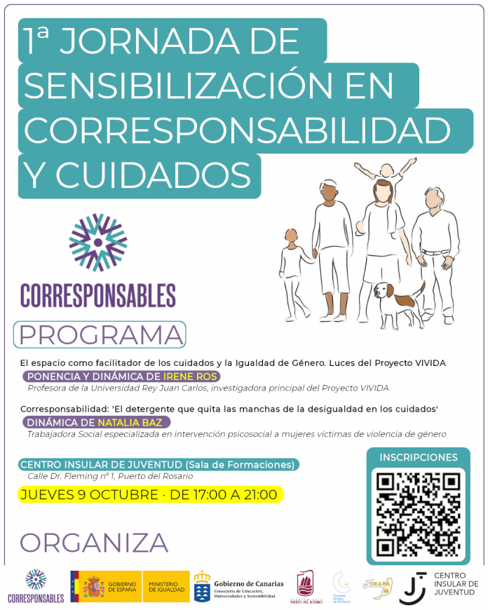 La corresponsabilidad en los cuidados familiares será el eje principal de la 1ª Jornada de Sensibilización a través de las dinámicas realizadas por Irene Ros y Natalia Baz. El evento tendrá lugar en la Sala de Formación del Centro Insular de Juventud de Puerto del Rosario de 17:00 a 21:00 horas, y está organizado por FIMAPA (Federación Insular Majorera de AMPAs) y el Área de Igualdad, Diversidad y LGTBI+ del Ayuntamiento de Puerto del Rosario como parte de la implantación del Plan Corresponsables del Ministerio de Igualdad en el municipio. La corresponsabilidad y los cuidados serán protagonistas en la 1ª Jornada de Sensibilización