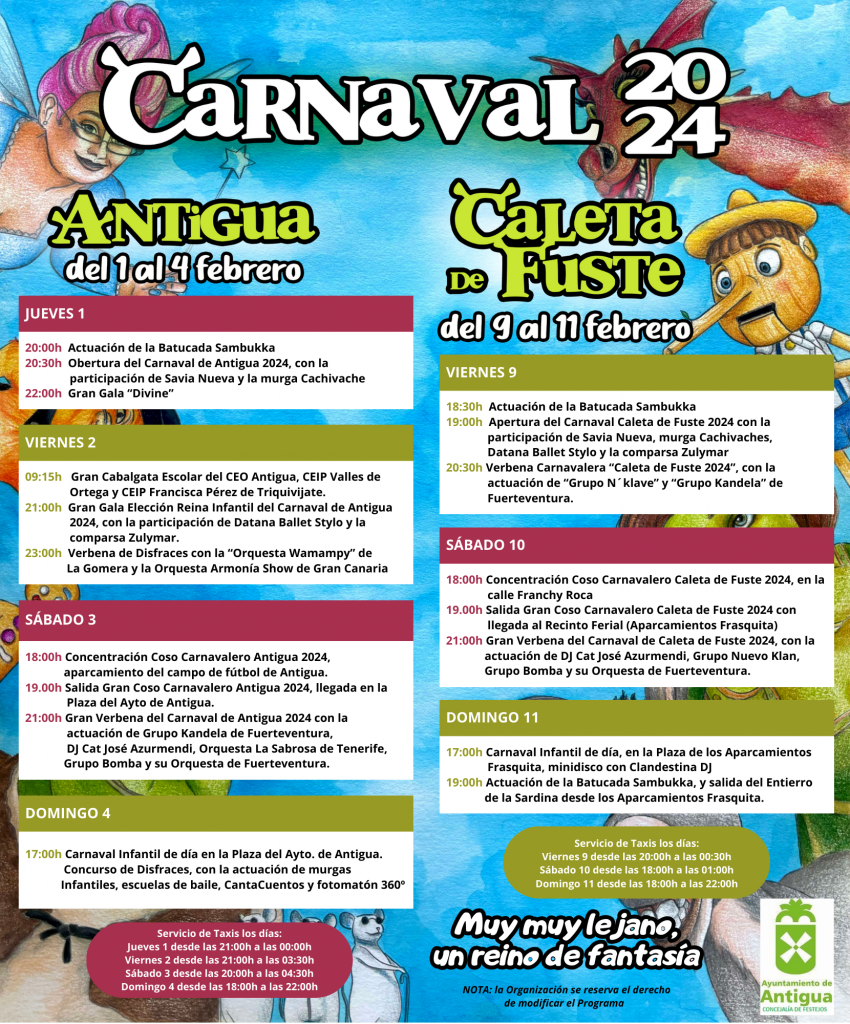 El Carnaval de Antigua 2024 organizado por la concejalía de Festejos que dirige, Agustín G. Rodríguez, arranca esta tarde de jueves con la Murga Los Cachivaches acompañados por la Escuela Savia Nueva, precedidos por la Batucada Sambukka. La Murga ‘Los Cachivaches’ inicia el Carnaval de Antigua.
