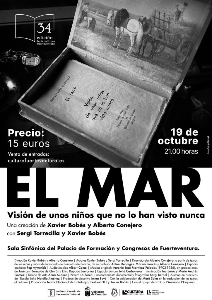 La Feria del Libro de Fuerteventura acogerá el próximo 19 de octubre el estreno en Canarias de la obra ‘El mar: visión de unos niños que no la han visto nunca’, fruto del primer encuentro como creadores de Xavier Bobés y Alberto Conejero (Premio Nacional de literatura dramática 2019). La obra ‘El mar: visión de unos niños que no la han visto nunca’ en la Feria del Libro de Fuerteventura.