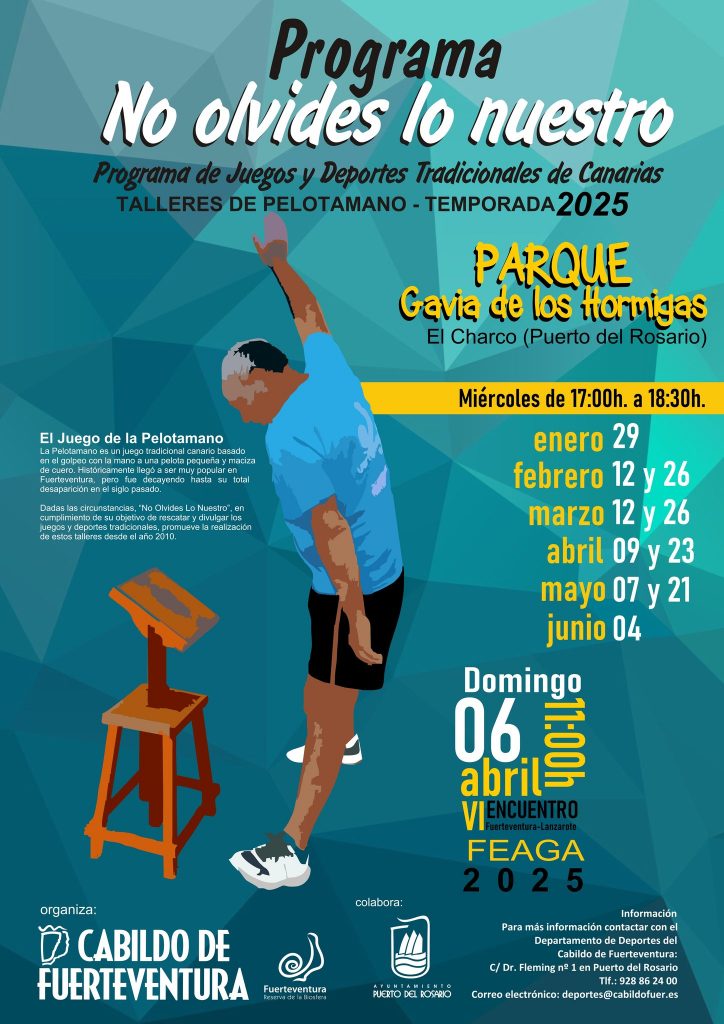 Los juegos y deportes tradicionales y en el caso de la pelotamano siguen muy presentes. Así, este miércoles 26 de abril tendrá lugar un taller en el Parque Gavia de los Hormiga, en el barrio de El Charco en Puerto del Rosario. La Pelotamano sigue los talleres en la Gavia Los Hormiga y el 6 de abril encuentro en FEAGA.