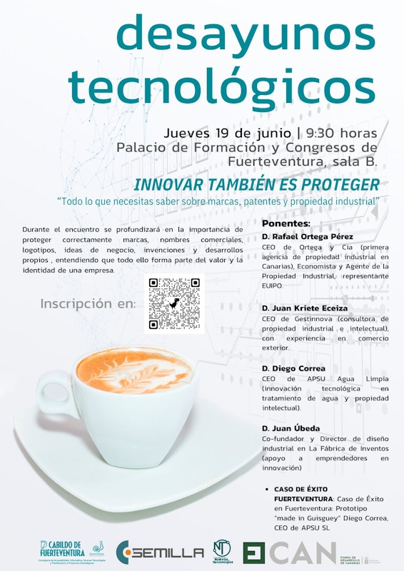 El Cabildo de Fuerteventura, a través del área de Nuevas Tecnologías que dirige la consejera Carmen Alonso, recuerda que el próximo jueves, 19 de junio, a las 09.30, se desarrollará una nueva sesión de los Desayunos Tecnológicos. La protección de la propiedad industrial en los Desayunos Tecnológicos