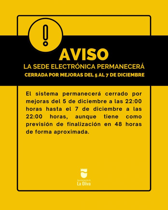 El departamento de Nuevas Tecnologías del Ayuntamiento de La Oliva informa la mejora de los servicios ofrecidos en la sede electrónica de la Administración municipal con el fin de sustituir de forma integral la red troncal del CPD. En consecuencia, el sistema permanecerá cerrado del 5 de diciembre a las 22:00 horas hasta el 7 de diciembre a las 22:00 horas, aunque tiene como previsión de finalización en 48 horas de forma aproximada. La Sede Electrónica del Ayuntamiento de La Oliva permanecerá cerrada por mejoras del 5 al 7 de diciembre