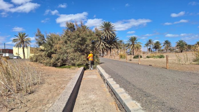 El trabajo se centró en los arcenes de la carretera de acceso a Gran Tarajal, donde se intervino en más de 3,5 kilómetros lineales de vía despejando de maleza y basuras los márgenes de la carretera y liberando de obstrucciones las canalizaciones de agua.