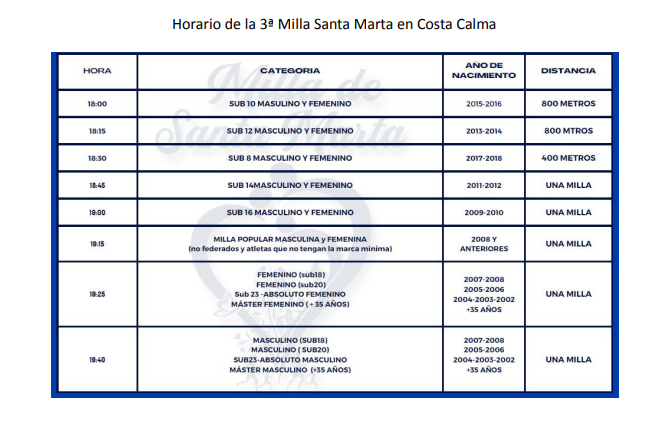 La milla de Costa Calma es la única del municipio de Pájara, y tendrá lugar en horario de tarde-noche. La organización ha previsto entregar medallas a todos los participantes en las categorías sub8, sub10, sub12 y sub14, y trofeos para los tres primeros clasificados de cada categoría, tanto en masculino como en femenino, además de premios en metálico para la prueba reina (70, 50 y 30 euros), tanto en masculino como en femenino.