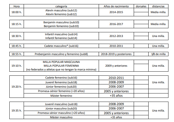 La competición se desarrollará desde los prebenjamines hasta los másteres, agrupados en 19 categorías y con unas distancias que oscilan desde los 300 metros (para sub8) hasta la milla, pasando por la media milla.