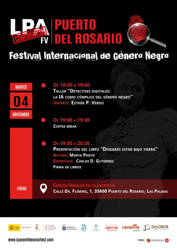 El Festival Internacional de Género Negro LPA Confidencial 2025 inicia su despliegue interinsular en Fuerteventura. Así, lleva la trama de espías y secretos de la Segunda Guerra Mundial hasta la capital majorera. Este martes, 4 de noviembre, el Centro Insular de la Juventud de Puerto del Rosario acogerá una doble jornada de misterio. También literatura y tecnología, abierta al público de manera gratuita. Marta Prieto da el pistoletazo de salida de LPA Confidencial en Fuerteventura