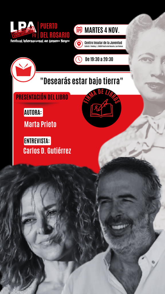 Tras una pausa para el café a las 19:00 horas, la actividad central de la noche arrancará a las 19:30 horas con la presentación del libro «Desearás estar bajo tierra». La autora, Marta Prieto, compartirá los secretos de su última obra en un diálogo conducido por el escritor majorero Carlos Gutiérrez. Prieto, cuya primera novela reconocida con el prestigioso Premio Memorial Silverio Cañada en la Semana Negra de Gijón. Garantiza una mirada profunda en el lado oscuro de la condición humana, sello del mejor género negro. Acompañada por Carlos Gutiérrez, ingeniero, profesor universitario y autor de las novelas Sangre de perros y Tres tes. La experiencia como investigador literario promete un diálogo incisivo y lleno de pistas sobre el proceso creativo. La actividad concluirá con una firma de libros por parte de la autora.