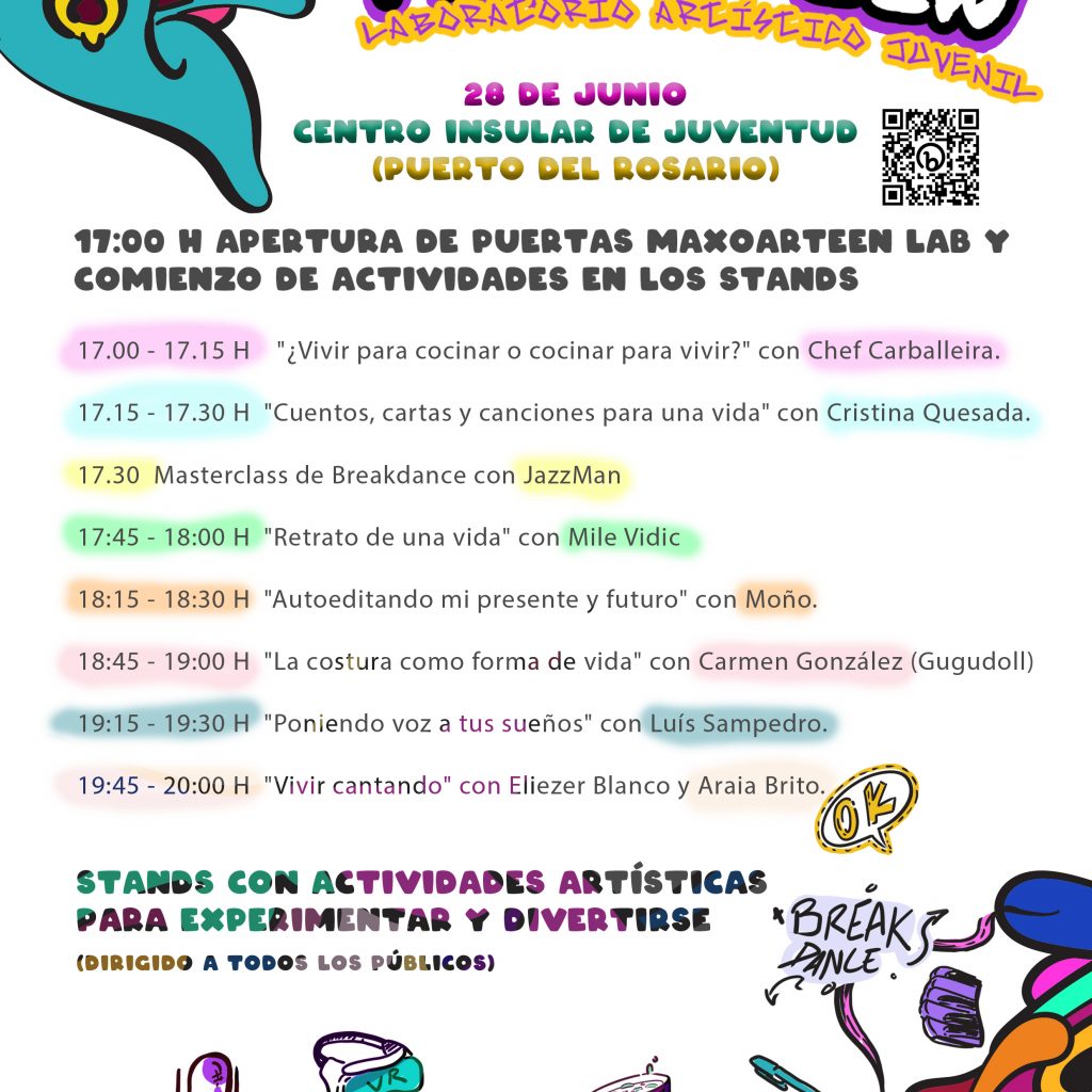 Maxoarteen Lab: El laboratorio artístico juvenil. Entre los invitados se encuentran destacadas figuras, como el chef Carballeira, quien deleitará a los presentes con su pasión por la gastronomía fusionada con el arte; la joven investigadora y literaria Cristina Padrón, quien compartirá su experiencia y conocimientos en el ámbito de la escritura y la investigación literaria; la especialista en danza urbana JazzMan, y Moño, que compartirá su visión artística y brindará una perspectiva única sobre el mundo de la ilustración.