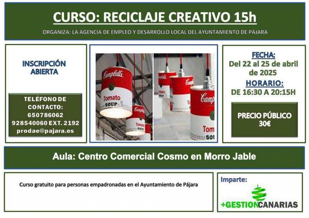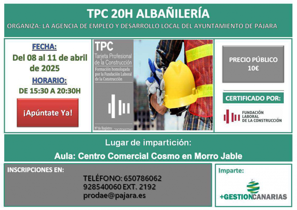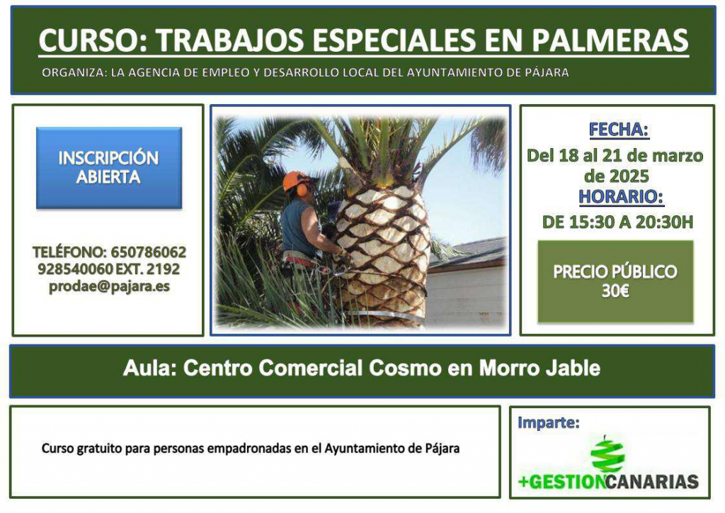 El plazo de inscripción está abierto. Y se puede realizar a través de los teléfonos 650 786 062 | 928 540 060 | Ext.2192 o a través del correo electrónico prodae@pajara.es . Toda la información no solo la pueden ver en los carteles de albañilería, reciclaje o trabajos especiales en palmeras sino también en el propio ayuntamiento.