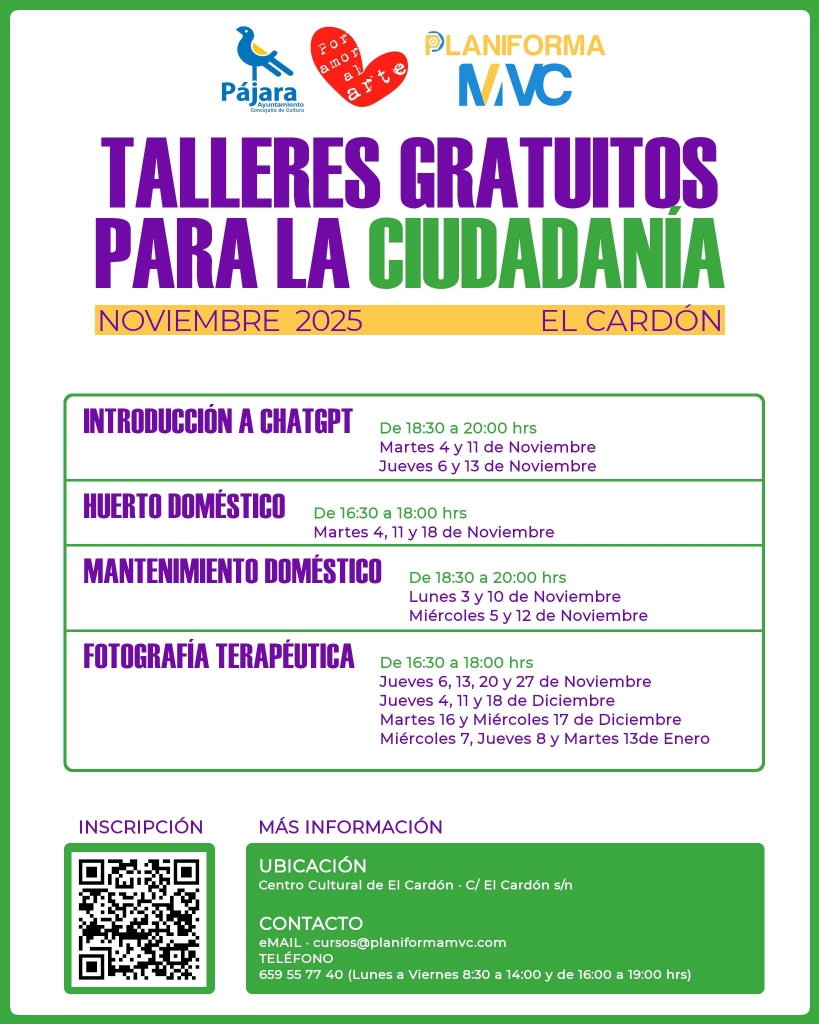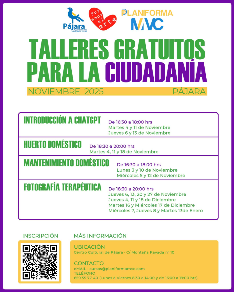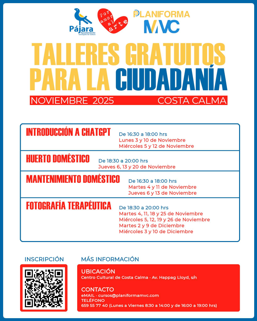 El Ayuntamiento de Pájara, a través de su Concejalía de Cultura, ha presentado una nueva propuesta de formación gratuita dirigida a mayores de 15 años, con la que busca fortalecer la participación vecinal y ofrecer alternativas de aprendizaje útil y creativo en distintos puntos del municipio. Pájara lanza una nueva oferta gratuita de talleres culturales y prácticos para jóvenes y adultos.