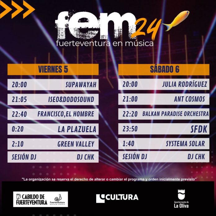 Más de una decena de artistas nacionales, internacionales y locales se subirán los días 5 y 6 de julio al escenario del festival Fuerteventura en Música (FEM) en la Playa de la Concha de El Cotillo. Un cartel con gran variedad de estilos musicales, contando este año con la actriz majorera, Mariam Hernández, como presentadora. Publicados los horarios de los conciertos del FEM 2024.