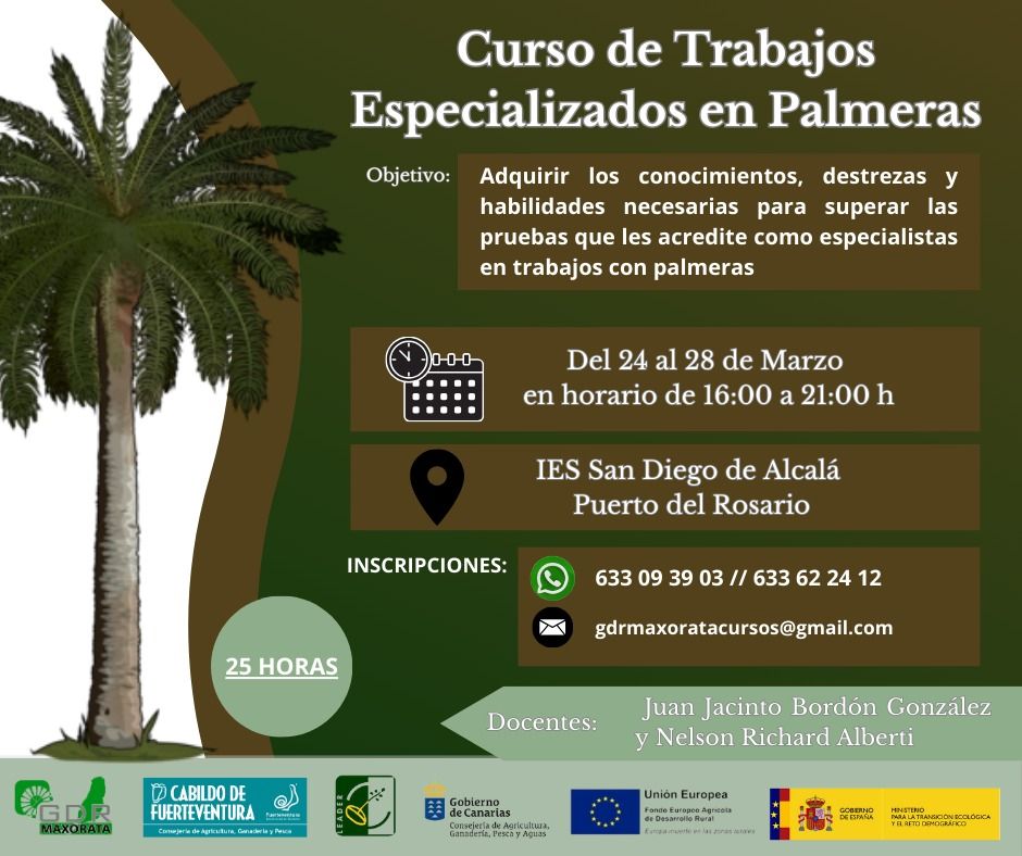 El Cabildo de Fuerteventura, junto con la asociación GDR Maxorata, continúa promoviendo la capacitación en el sector agrícola y ganadero de la isla con el fin de fomentar el desarrollo rural. En esta ocasión, se ofrecerá la segunda edición del curso de «Trabajos Especializados en Palmeras», dirigido a quienes deseen especializarse en el cuidado y mantenimiento de esta especie.