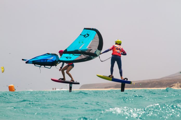A las dos de la tarde de ayer comenzaba la competición de Wingfoil con las primeras rondas eliminatorias masculinas y femeninas del FreeFly-Slalom. Los/as competidores se preparaban para entrar al agua al mismo tiempo que oían las palabras del director del evento, Tom Hartman, “esta es la 36ª Copa del Mundo de Fuerteventura, un evento legendario que ha dado origen a los windsurfistas y kitesurfistas más galardonados del mundo. Ahora ustedes son las estrellas del escenario”, les dijo a los participantes en la reunión previa con sus maillots de color rosa y naranja.