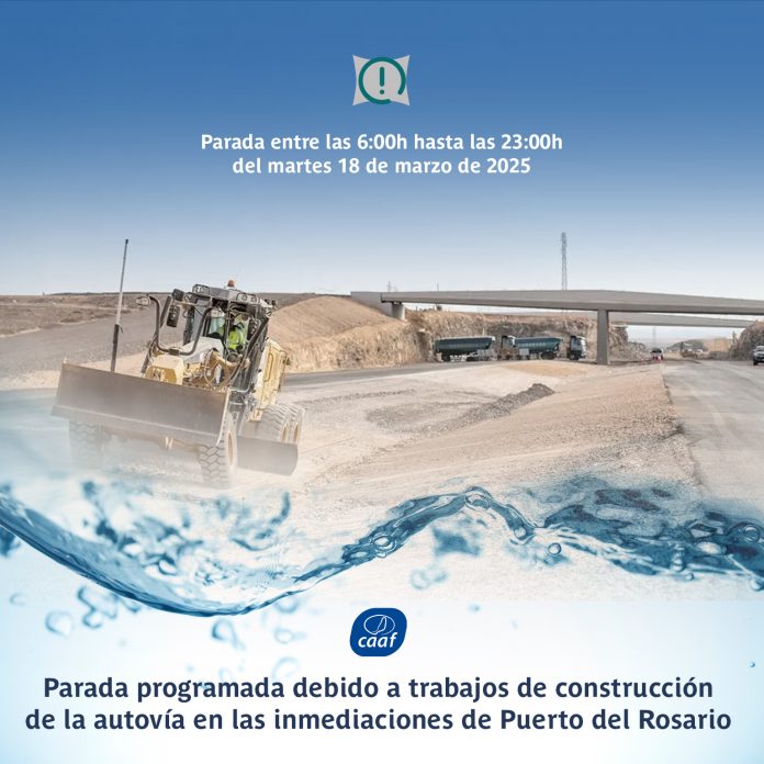 Debido a los trabajos de construcción de la autovía en las inmediaciones de Puerto del Rosario, la empresa encargada de la obra requiere interrumpir el suministro de agua el próximo martes 18 de marzo desde las 06:00 hasta las 23:00 en las siguientes zonas: