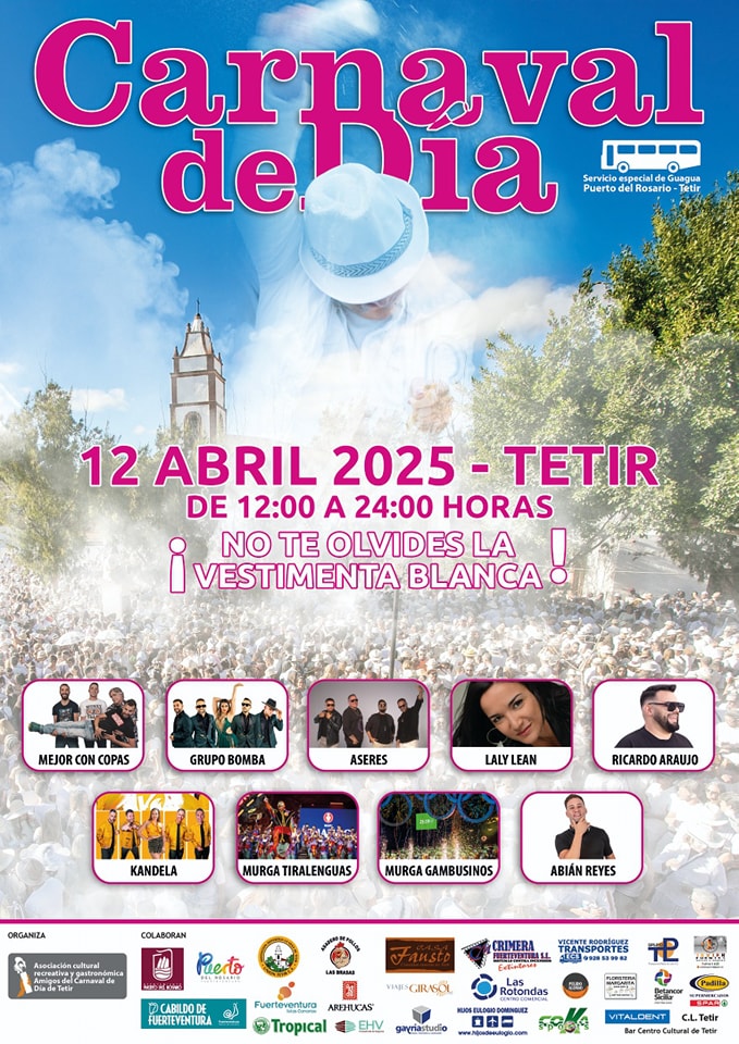 Tetir ya está preparado para vivir una nueva edición del Carnaval de Día, uno de los eventos más importantes del calendario festivo de Fuerteventura. Este año, se celebrará el sábado 12 de abril, desde las 12:00 hasta las 24:00 horas. Durante ese tiempo, habrá 12 horas seguidas de música y fiesta sin interrupciones. Tetir se prepara para vivir su gran ‘Carnaval de Día’ este sábado 12 de abril.