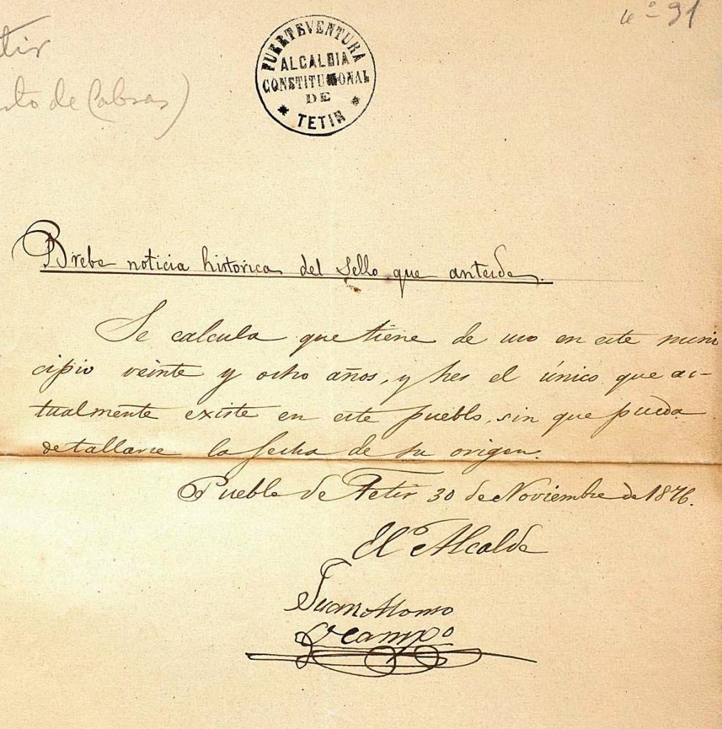 “Viose una instancia de los pueblos de Time, Matilla y Guisguey en la isla de Fuerteventura en la que manifiestan que habiendo procedido el de Tetir a crear su Ayuntamiento Constitucional, no contando para sus elecciones con los vecinos de los indicados pueblos, sin embargo de pertenecer a su Parroquia, formando ellos de común acuerdo el suyo sin contradicción alguna, por manera que los electos se posesionaron y siguieron ejerciendo sus funciones hasta que por orden del sr. Jefe Superior Político se les mandó cesar como así lo ejecutaron y solicitan que se les permita ser regidos y gobernados por un Ayuntamiento independiente del de Tetir, continuando el que tenían establecido por exigirlo así el bien de