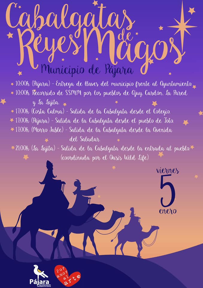 Este viernes, desde las 10:00 horas y hasta las 21:00 horas, los pueblos de Pájara, Ajuy, Costa Calma, Morro Jable, Cardón, La Lajita y La Pared serán recorridos por Sus Majestades para que niños y niñas de todos los rincones del municipio disfruten de esta especial fecha.