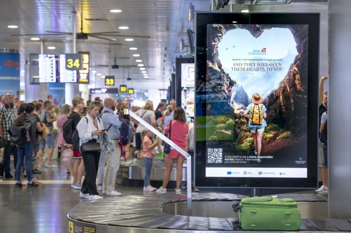 Durante el segundo semestre del año pasado, la empresa pública Turismo de Islas Canarias activó la campaña de sensibilización con un acción en los ocho aeropuertos del archipiélago protagonizada por el eslogan ‘Respeta el medioambiente de las islas y ellas te abrirán su corazón’. El objetivo era el de trasladar a los turistas desde el mismo momento de su llegada la importancia de adoptar comportamientos respetuosos con el entorno.