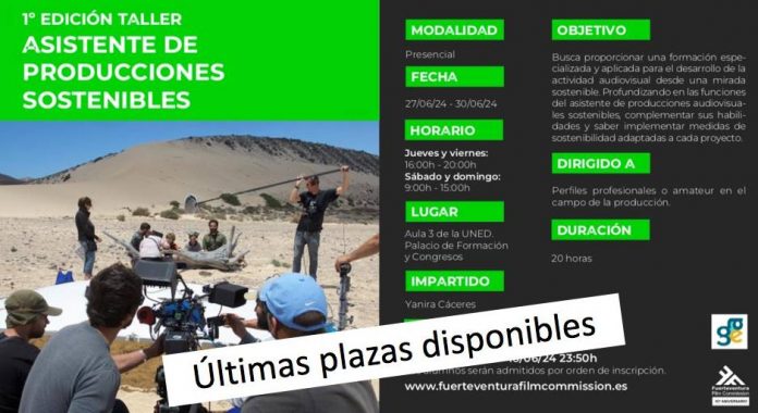 Fuerteventura Film Commission impartirá del 27 al 30 de junio el taller de asistente de producciones audiovisuales en el Palacio de Formación y Congresos, dentro de su programa para formar a profesionales y personas interesadas en iniciarse en el sector audiovisual. Las inscripciones están abiertas hasta el próximo 23 de junio, quedando disponibles las últimas plazas. Últimas plazas para el taller de asistente de producciones de FFC.