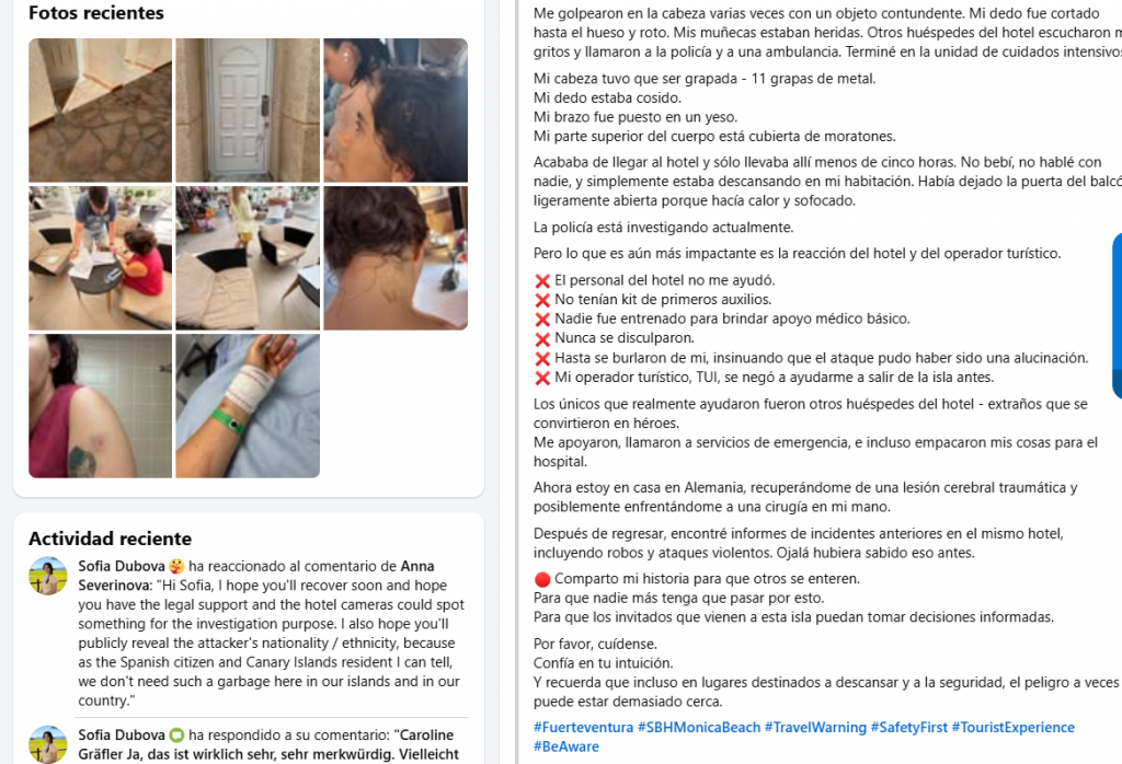 Para consternación de la afectada, la seguridad del complejo «no estuvo a la altura». Según su testimonio, «los únicos que realmente ayudaron fueron otros huéspedes del hotel – extraños que se convirtieron en héroes. Me apoyaron, llamaron a los servicios de emergencia, e incluso enviaron mis cosas para irme al hospital. Ahora estoy en casa en Alemania, recuperándome de una lesión cerebral traumática y posiblemente enfrentándome a una cirugía en mi mano»